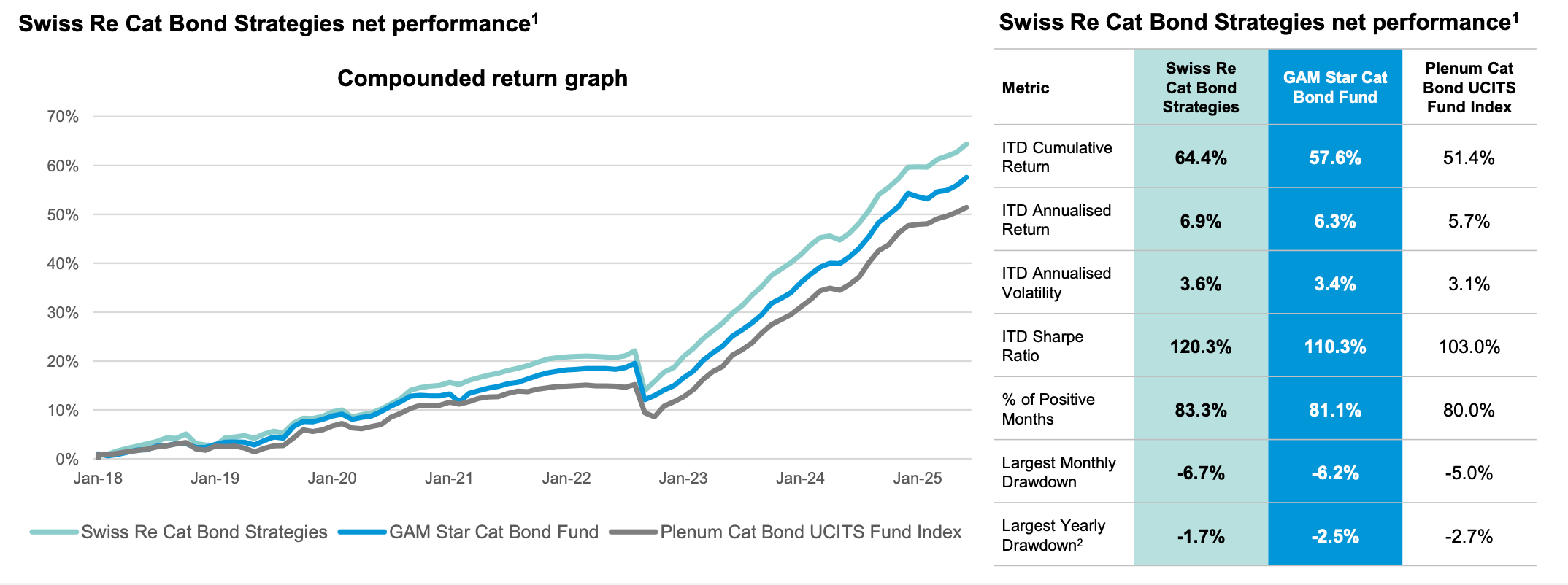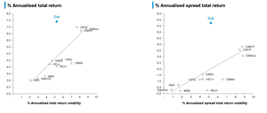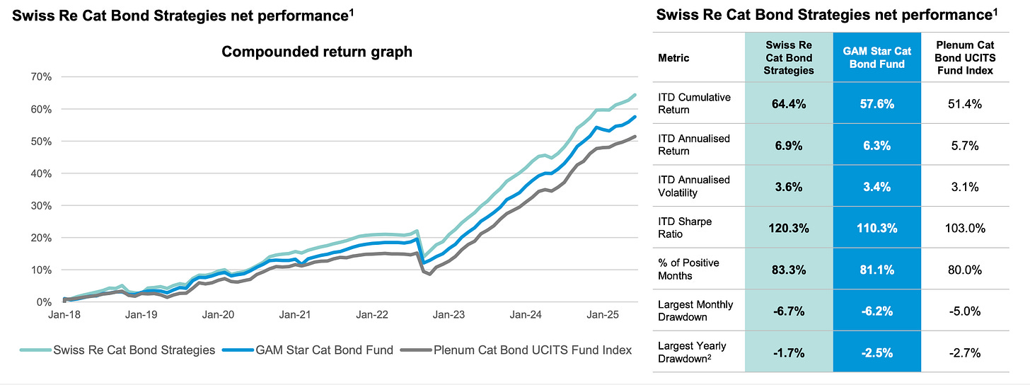 Los rendimientos de los cat bonds permanecen históricamente atractivos; por ejemplo, en el caso de GAM Star Cat Bond y la estrategia Swiss Re asociada, sus retornos anualizados y Sharpe ratios han sido superiores a los de bonos high yield y otras alternativas.
