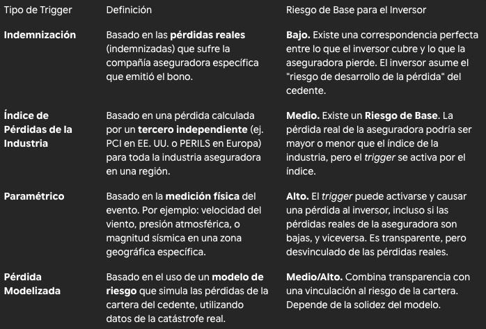 El trigger es la condición predefinida que, al cumplirse, activa la transferencia del principal (el colateral) del inversor a la aseguradora/reaseguradora (cedente). La elección del tipo de trigger es una negociación clave que define la estructura de riesgo de un bono ILS.