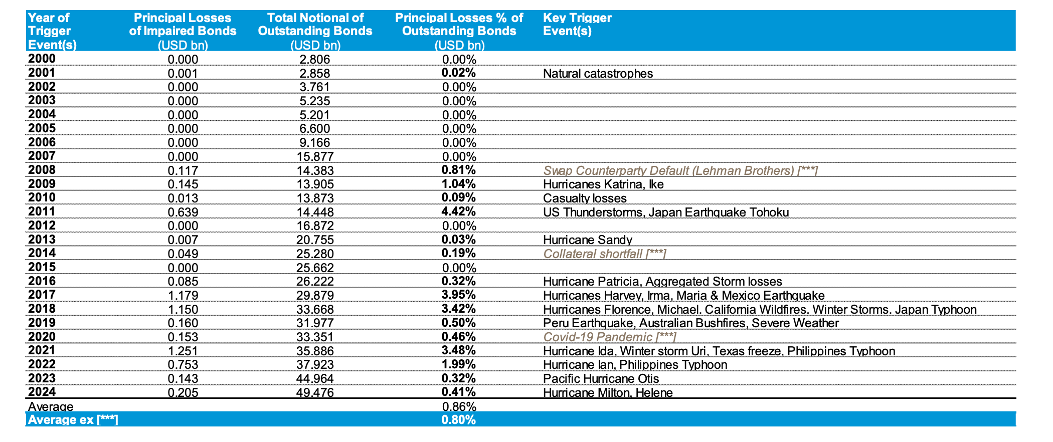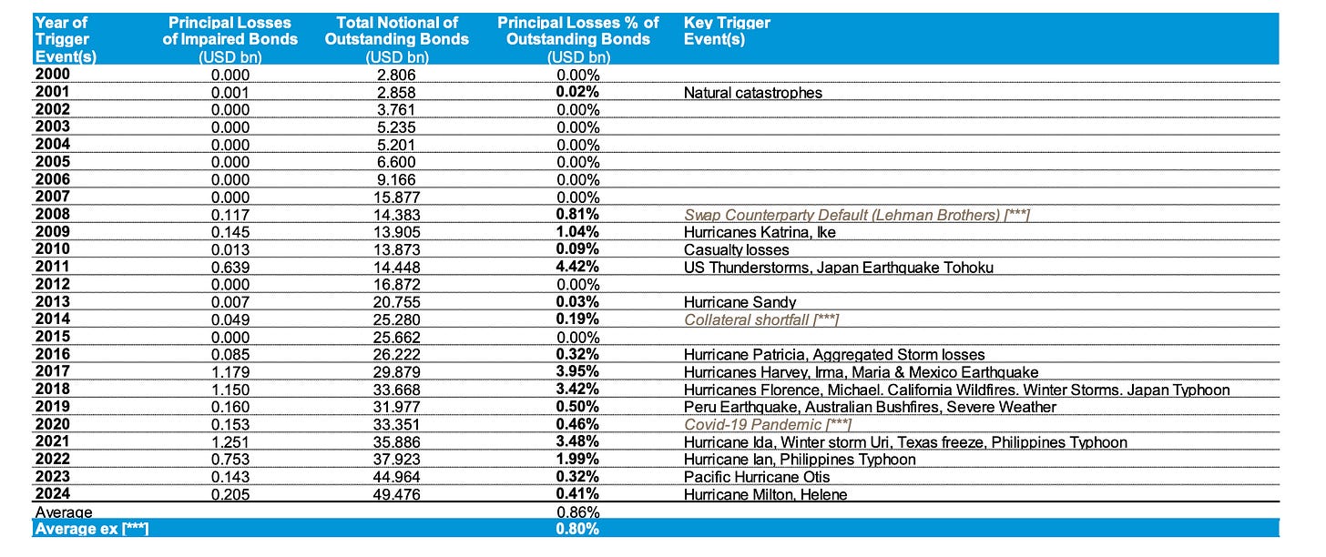 Los casos más extremos han sido el Huracán Katrina (2005) y más recientemente, el Huracán Irma (2017) en el Caribe y Florida, y el Tifón Jebi (2018) en Japón, han provocado pérdidas notables, con un impacto variable según el tipo de trigger utilizado en cada bono.