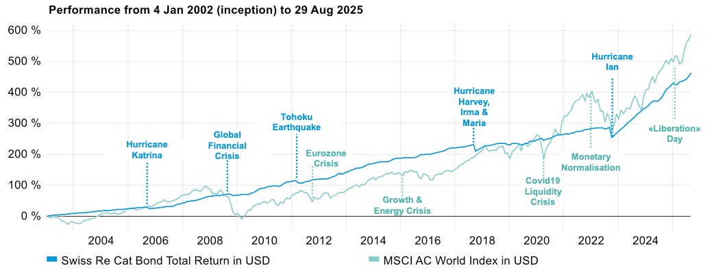 Los bonos catástrofe (“cat bonds”) resultan muy interesantes en una cartera diversificada por su perfil de riesgo-rendimiento, su baja correlación con activos tradicionales y su capacidad de generar retornos atractivos en escenarios de volatilidad de mercado.