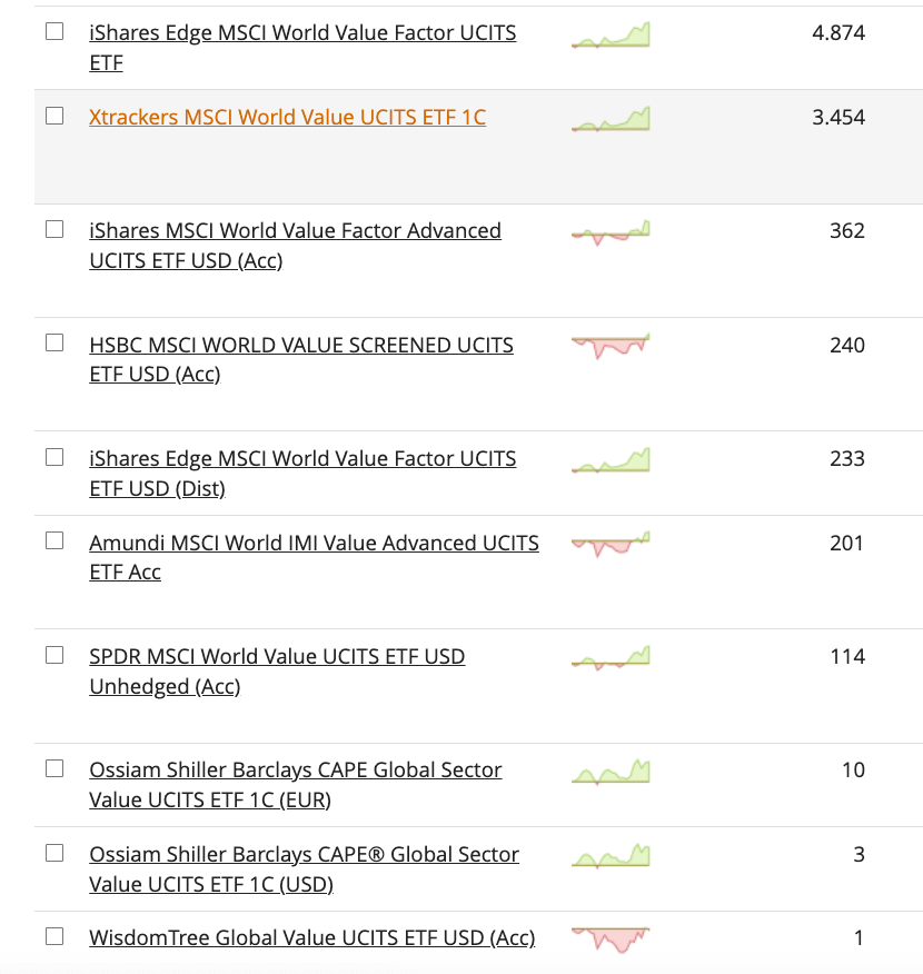 Si vamos a la lista de ETF listados en Europa de factor value nos encontramos que la mayoría utilizan a la familia de MSCI como referencia.