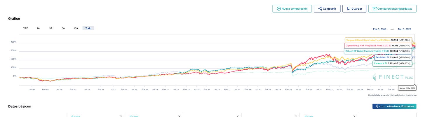 En honor a la verdad, en el apartado gráfico de la ficha de un fondo de Morningstar se pueden añadir todos los productos que quieras para comparar; incluso tienen un histórico anterior a 2008, que es hasta donde ofrece Finect.