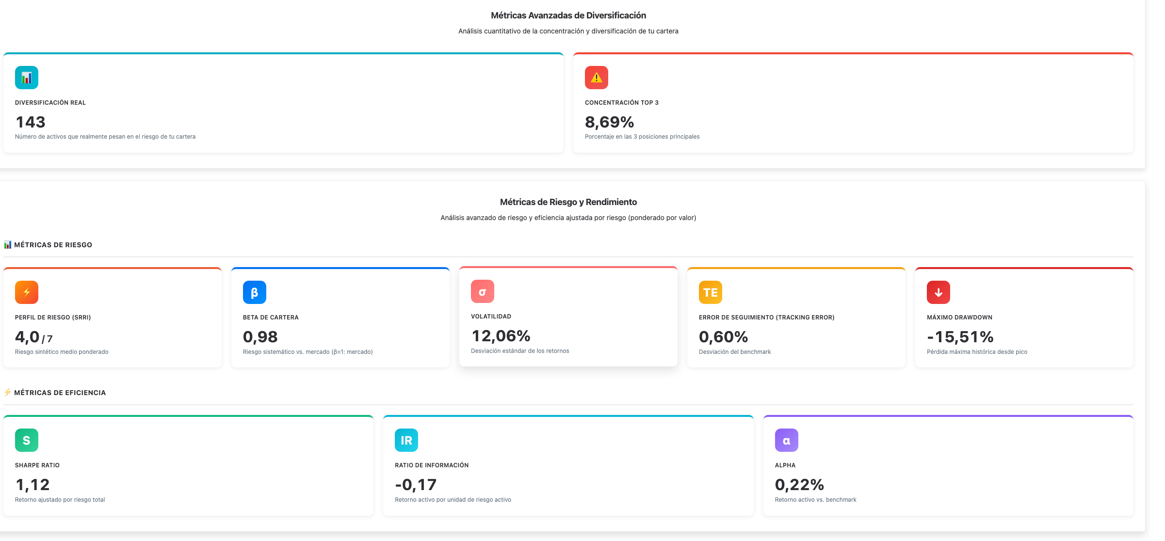 Para mi gusto le faltaría poder saber dos cosas: ¿Qué índice de referencia se ha utilizado? ¿Qué período se ha utilizado para métricas como los ratios o el drawdown?